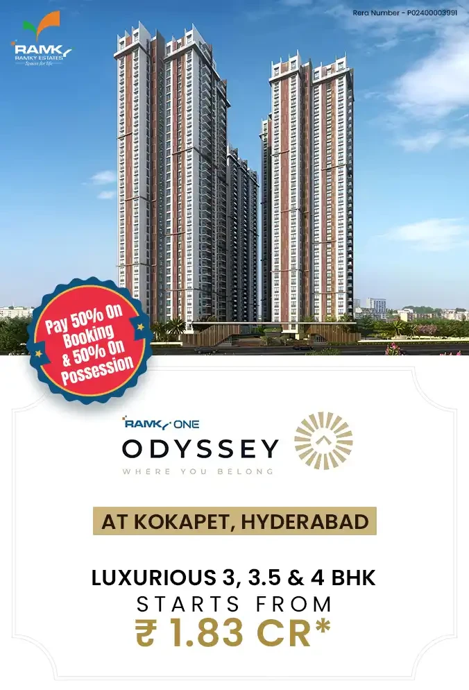 Experience elevated living at Ramky Odyssey, a premium residential project by Ramky Estates at Kokapet, Hyderabad. Spread across 5.3 acres, Ramky Odyssey features 3 elegant towers housing 783 thoughtfully designed 3, 3.5 & 4 BHK homes. Residents enjoy access to a 50,000 sq. ft. clubhouse and 45+ world-class amenities. Dive into the pool with a toddler’s zone, or recharge in the air-conditioned gym, yoga, meditation, and aerobics rooms. Ramky Odyssey also includes a crèche, guest rooms, ATM, indoor badminton and squash courts. Enjoy table tennis, billiards, chess, and carroms in the indoor games room. Ramky Odyssey offers a vibrant lifestyle designed for comfort, wellness, and community living.